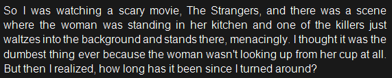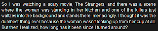 This scene was particularly effective as the fact that this complete masked stranger is in her home, a place where you should keep the safest almost radiates disturbance and broke the barrier between what is known as comfortable to an audience. This scene also came under scrutiny with the public when people asked the question 'Why didn't she turn around?' which almost questionned the film's feability as legitimately 'scary'. Although when a random post turned up on a blogger website answered everyone's question, the feel seemed as eerie and as disturbing again.